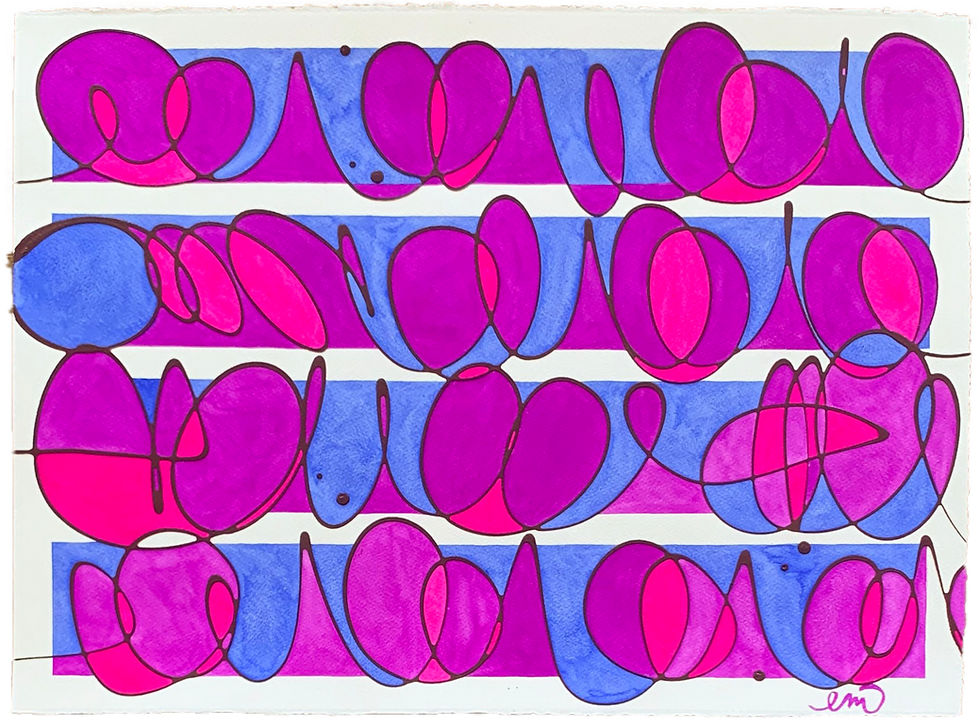 My graffiti paintings on paper have evolved over time and highlight my love and trust in the expressive power of color and movement. At times, I find myself thinking of these paintings as unconventional sheet music—the swoops and dips of the graffiti give tempo to the composition, and the colors add depth and emotion. In many ways, these paintings represent a visual soundtrack.